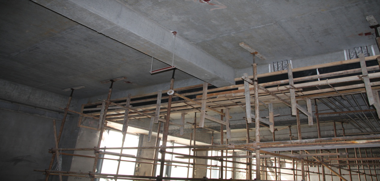 依据加固设计施工图纸,本工程采用的主要加固施工方法:脚手架支撑卸荷、梁加大截面、柱加大截面、新加框架梁等。主要施工工艺:混凝土界面剔凿、化学植筋、特种混凝土浇灌等。特种专业施工材料:喜利得HILTI HIT-RE 500锚固剂、北京联合荣达RG灌浆料。