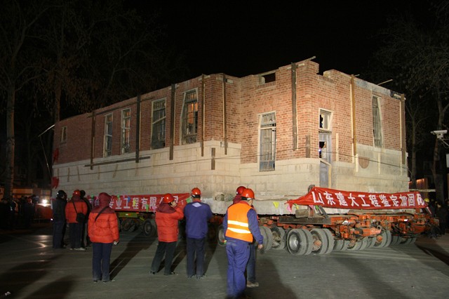 该建筑原位于繁华市区,为了尽量减轻道路交通压力, 对运输线路进行了详细勘察,迁移于3月1日21:38分开始,迁移过程中,老别墅四次屈身过街天桥,三过立交,于3月2日11:43安全到达山东建筑大学新校区。整个迁移过程历时14小时,迁移距离为30公里。